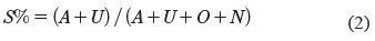 A avaliação de um atributo surge quando da classificação em obrigatórios, unidimensionais e atrativos. Propor atributos unidimensionais têm uma maior influência na percepção da qualidade, e na satisfação do cliente (Matzler e Hinterhuber, 1998). A satisfação ocorre quando um requisito está presente no produto ou serviço. A soma do número de consumidores cujas respostas à pesquisa se enquadram nas categorias unidimensionais e atrativas, é dividida pelo total de respostas positivas ou neutras ao requisito, conforme a Equação 2 (respostas que qualificam o requisito como reverso não são consideradas nesta função).
