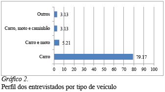 Em relação a qual demanda é mais comum no polo 54,2% responderam que vão ao polo buscando comércio, 27,1% buscando serviços e 18,8 a procura de ambos. Já na quantidade de vezes ao ano que frequenta o polo, 62,5% vão de 1 a 3 vezes no local, 22,9% vão de 3 a 5 vezes e 14,6% vão mais de 5 vezes ao local. Outro fator relevante para identificar o perfil do consumidor é qual o veículo ele possui e consequentemente costuma fazer manutenção e reparos no polo, esses números são representados no gráfico 2.