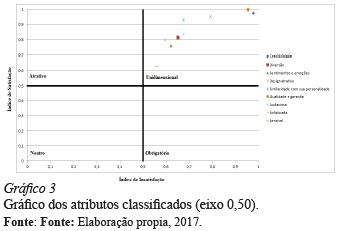 A partir dessa premissa foi utilizado o gráfico 5 como base para a nova classificação. Assim, os atributos em que a pesquisa resultou como unidimensionais para os dois quadrantes (0,50 e 0,70) foram considerados para a nova etapa, utilizando tal metodologia foram selecionados 3 atributos: credibilidade, design atrativo e qualidade e garantia.