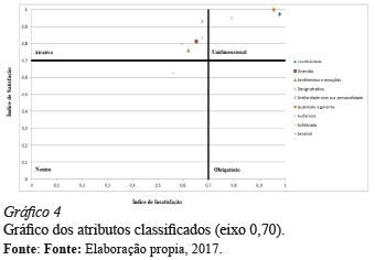 O resultado encontrado no gráfico 4 era esperado no estudo, já que os atributos utilizados foram selecionados de estudos anteriores, citados no referencial teórico, isso acontece devido a um alto nível de satisfação dos clientes com os atributos identificados na base teórica. Este resultado corrobora com as evidências apresentadas por Aaker (1997) e Muniz e Marchetti (2005). Para se identificar os atributos mais relevantes daqueles apresentados é utilizada uma análise baseada na sugestão de Tontini e Sant’ana (2007), ajustando a linha que separa os quadrantes para 0,70, criando a possibilidade de refinar e melhor compreender o objeto estudado.