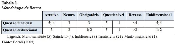 Um cruzamento entre as respostas levará à classificação de acordo com a escala de respostas likert (1932), baseando-se na curva de satisfação do cliente pela presença ou pela falta do requisito. A fim de apontar a classificação dos atributos segundo o modelo de Kano, pode ser utilizada a classificação proposta por Borsoi (2005), conforme tabela 1.