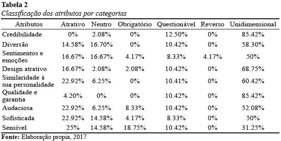 Depois de realizada a tabulação dos questionários e a fim de apontar a classificação dos atributos segundo o modelo Kano, foi utilizada a mesma metodologia que o autor Borsoi (2005) e Matlzer (1996) para o tratamento dos questionários. Assim foi feita a relação de cada questão funcional e disfuncional a fim de determinar qual seria a classificação do atributo segundo a proposta do modelo Kano. A tabela 2 ilustra quais foram os percentuais obtidos por cada atributo.
