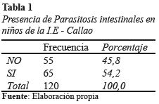 Para los exámenes coproparasitológicos se analizó un total de 120 muestras de heces de niños, se encontró que 65 muestras analizadas (54.2%) presentaron algún tipo de parásito