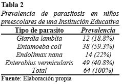De los parásitos hallados en el estudio, 49 muestras (40.8%) correspondieron a Enterobius vermicularis, 12 (18,8%) Giardia duodenalis, 38 (59.3%) Entamoeba coli y 14 (22%) Endolimax nana en las heces de los niños de 3 a 5 años (Tabla N° 2). La frecuencia de parasitosis intestinal fue bastante elevada en la población estudiada (54.2 %).