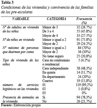 En este estudio, el 55% de las familias de los niños conviven con tres a cuatro adultos y el 33% con más de cuatro adultos en la familia. El número máximo de personas que duermen por cama es mayor a 2 en un 30% y el número de niños en casa es mayor de 2 en un 29%, el 58% vive en casa independiente, el 20% en departamento. Asimismo, el 99% cuentan con un solo servicio higiénico en su casa y el 78.3% tienen animales en casa (Tabla 3)
