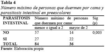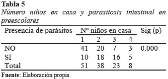 Por tanto, la presencia de algún tipo de parásito en niños menores de 5 años de edad está fuertemente influenciada por el hacinamiento y la falta de higiene. En nuestro estudio se halló una presencia significativa de parasitosis en niños, así como un gran número de personas que duermen en cama en proporción al número de niños que viven en casa (p < 0.05) (Tabla 4 y 5).
