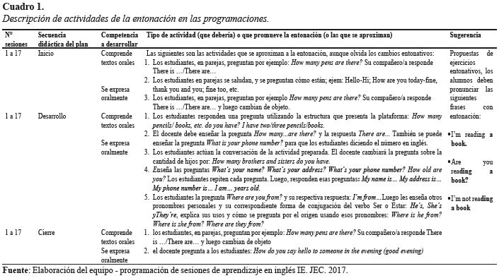 La enseñanza de la entonación, afirma Hernández (2015), se realiza en tres fases: 1) la educación del oído o percepción de los cambios entonativos, para este propósito se puede programar actividades como pronunciar las siguientes frases: I’m reading a book; Are you reading a book? y I’m not reading a book. 2) la producción guiada por el docente en la que los alumnos sean capaces de repetir enunciados o textos que el docente lleve al aula, en este caso el profesor conduce la pronunciación. Y 3) la producción comunicativa, en la que el alumno sea capaz por sí mismo reproducir variaciones entonativas. En el siguiente cuadro se describe los contenidos de la entonación en actividades programadas para sesiones de aprendizaje del curso de inglés.