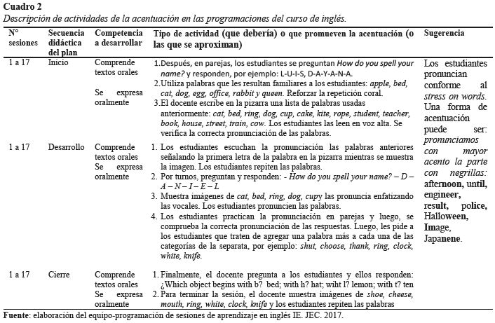 En el cuadro 2 hay nueve actividades, una de ellas describe: después, en parejas los estudiantes se preguntan How do you spell your name? y responden, por ejemplo: L-U-I-S, D-A-Y-A-N-A. Esta actividad promueve la repetición de vocales, consonantes, división silábica, acento de intensidad y a veces el acento ortográfico; basada en la lecto-escritura; pero ninguna promueve la acentuación del idioma inglés. De acuerdo con Hernández (2016), el primer ejercicio que se puede resaltar en clase la actividad de escuchar palabras; por ejemplo, conforme al stress on words, una forma de acentuación puede ser: pronunciamos con mayor acento la parte con negrillas: afternoon, until, engineer, result, police, Halloween, Image, Japanene.