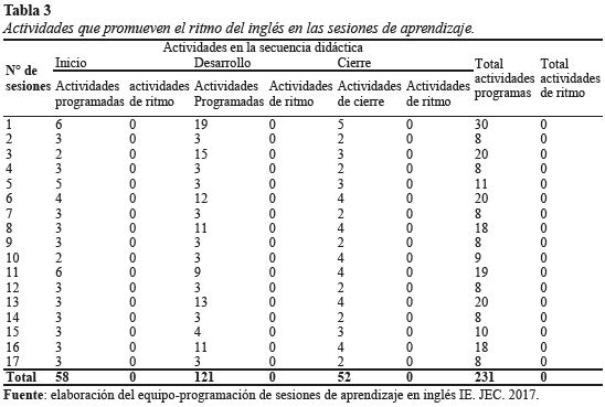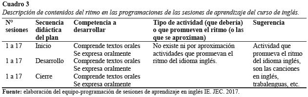 En el cuadro 3, se constata que no se programa actividades para promover el ritmo del idioma inglés. Si se deseará trabajar el ritmo de una lengua tenemos el Ejemplo de William Shakespeare: When I do count the clock that tells the time. (Cuando cuento el reloj que da las horas) To be, or not to be, that is the question. (Ser o no ser, esa es la cuestión); Double, double toil and trouble; Fire burn, and caldron bubble. (Doble, doble esfuerzo y problema; el fuego arde y el caldero burbujea). Por lo cual Hernández (2015), considera tres formas para aprender el ritmo: 1) la percepción y la sensibilización del oído a las características del ritmo en español; 2) la producción e imitación por parte del alumno guiado por el docente y 3) la producción libre y practica comunicativa.
