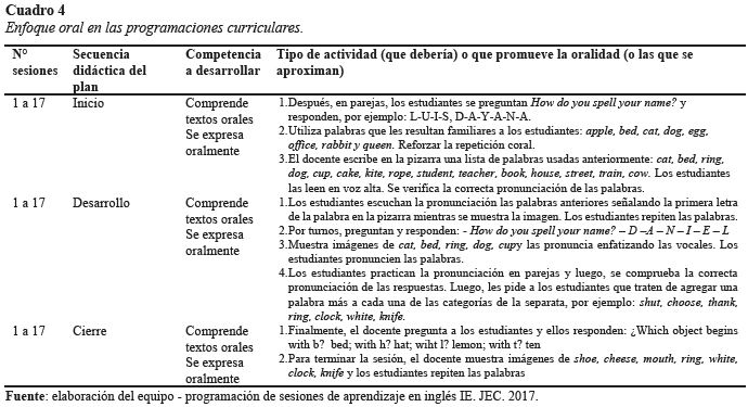 El enfoque oral en las programaciones curriculares del curso de inglés en las instituciones educativas de jornada escolar completa, considera el proceso de interacción dinámica entre uno o más interlocutores para comunicar sus ideas y emociones en el aula a partir de la lectoescritura para la enseñanza del inglés. Las razones fundamentales para promover la oralidad es hacer uso de la lengua para comunicarse; sin embargo, la oralidad en las programaciones curriculares está como ausentes. Casi todas las actividades programadas para una sesión de clases en inglés inician con la lecto-escritura.