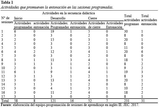 De la tabla 1 se advierte que en 17 sesiones del curso de inglés existen 231 actividades programadas y solo hay 31 actividades que se aproximan con contenidos de entonación de las cuales 8 están en inicio, 16 en desarrollo y 7 en cierre. Ninguna de estas actividades promueve expresamente la entonación. Al respecto Backhouse (2011), conceptúa la entonación como una función lingüística socialmente representativa y que individualmente refleja diferentes sentidos en una oración; porque, la manera en que se entona una oración puede dar diferentes significados. Ejemplo: vengo (tono descendente) y ¿Vengo? (tono ascendente). Y por ello, es imprescindible poner énfasis en las actividades de entonación a través de ejercicios de comprensión auditiva; asimismo Balterio (2015), destaca que la pronunciación como la percepción de acentos son susceptibles de interaccionar con nuestros estudiantes; así como la producción individual de fonemas, palabras, frases, ritmo, entonación, etc.