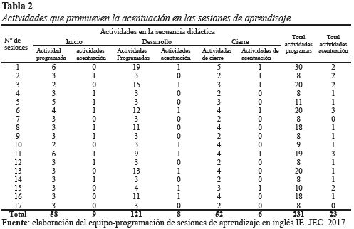 En la tabla 2 se observa que en 17 sesiones existen 231 actividades programadas de las cuales 23 actividades se aproximan a la acentuación. Ejemplo: se escribe shoe, cheese, mouth, ring, white, clock y knife. Luego, los estudiantes pronuncian el sonido del dígrafo consonante; o en parejas se preguntan How many pens are there? Su compañero/a responde There is .../There are... estas actividades promueven la lectura, la escritura, reconocimiento de las vocales y consonantes, etc. Pero ninguna de las actividades mencionadas promueve la acentuación. A ello corrobora Hernández (2015), el acento puede trabajarse desde tres opciones: 1) percepción y sensibilización del acento; 2) imitación y producción del acento, siguiendo normas de acentuación inglesa y 3) producción libre con una correcta acentuación. Aunque Vergara y Perdomo (2016), plantean el andamiaje de escritura creativa que fortaleció la producción oral y escrita en inglés de los estudiantes. Este fortalecimiento se vio reflejado en la fluidez oral, la pronunciación y el uso de la gramática durante las interacciones comunicativas.