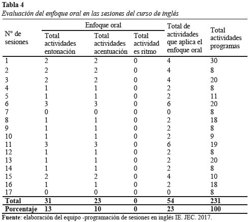 Oral approach in the curricular programming of the English course in the educational institutions of full school day, considers the process of dynamic interaction between one or more interlocutors to communicate their ideas and emotions in the classroom from the literacy for the teaching of English; which is an improper procedure. The purpose of the study is to evaluate the application of the oral approach in the curricular programming of the English course. The methodology is of an evaluative descriptive nature in which 17 scheduled learning sessions were analyzed for the 2017 academic period of the first grade of secondary education, to describe the types of activities that include intonation, accentuation and rhythm contents. The result of the evaluation of 231 programmed activities in a 23% is close to develop orality. In conclusion, the application of the oral approach in the curricular programming of the English course in JEC schools, there is little programming of intonation activities, accentuation and rhythm activities are not noticed to promote the orality of the English language.